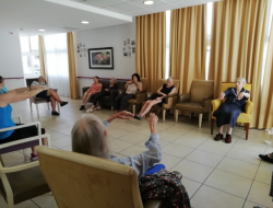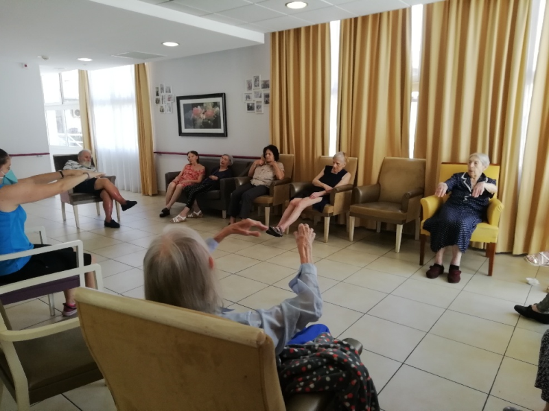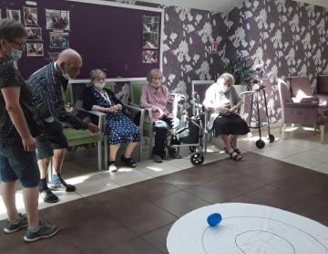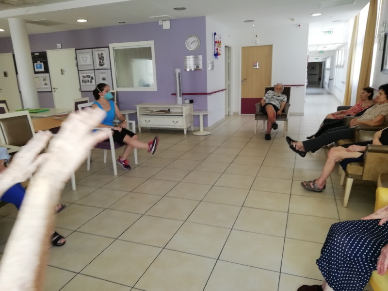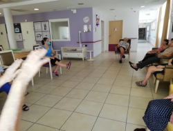 Les activités physiques ont repris un rythme normal depuis début juillet. Au programme : atelier prévention des chutes lundi et aujourd'hui Gym douce avec Siel Bleu. Les résidents semblent suivre malgré le masque des intervenants !