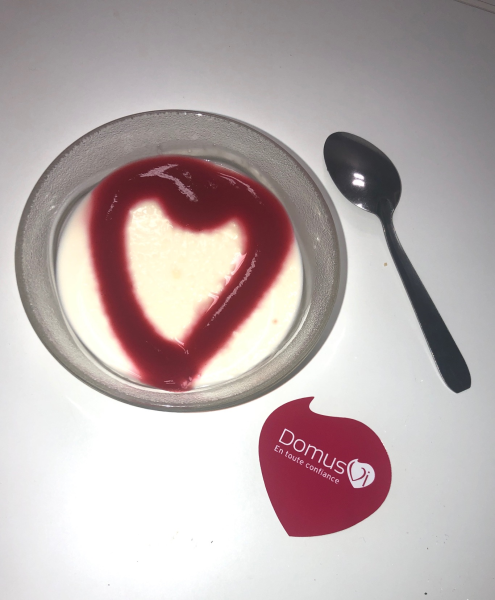 Aujourd'hui, pour la fête des amoureux, Frédérique avait préparé une Panna Cotta aux fruits rouge pour la Saint Valentin. Le coeur, symbole de l'amour mais aussi de DomusVI, était aussi au menu. Merci pour ce délicieux dessert !