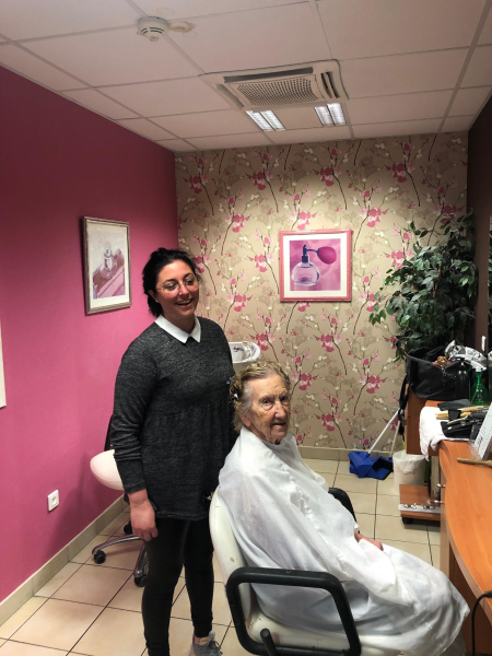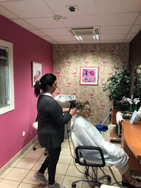 Depuis le début du confinement, nos résidents peuvent compter sur les équipes. Toute l'équipe est présente et certains se proposent pour occuper nos résidents en petits groupes : Guy a fait le café journal, Corinne a fait un atelier jeux d'esprit. Aujourd'hui, c'est au tour de Frédérique, notre aide-cuisinière de nous faire profiter de ses talents. Diplômée en coiffure, elle a proposé aux résidentes de s'occuper d'elles!