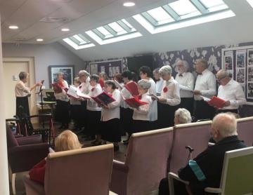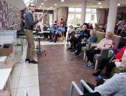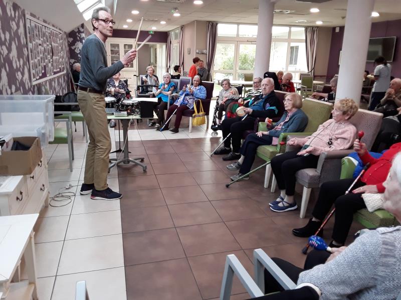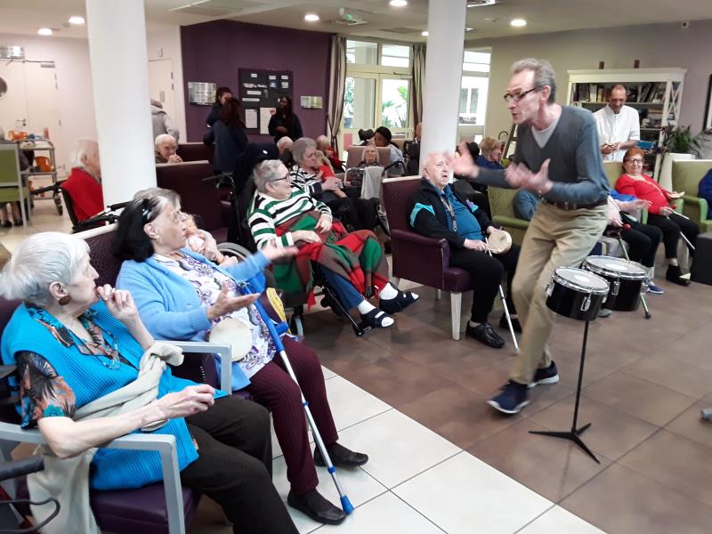 Cette après-midi, nouvel atelier "Rythmique et percussions". Les résidents munis de maracas, de tambourins, de crécelles, ont été initiés aux musiques rythmées. Tous en cadence, ils ont joué des instruments et au final cela s'est terminé par des chansons reprises en choeur.