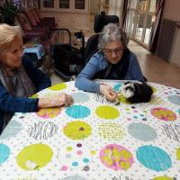 Publiée le 18/03/2022Si la semaine passée, certaines résidentes étaient allées voir des animaux dans une ferme, hier ceux sont des animaux qui sont venus rendre visite aux résidents. Sophie, la zoothérapeute est arrivée accompagnée de lapins, cochons d'Inde, colombes, et de deux poules. Malheureusement, il n'y avait pas la chie [...] Lire la suite