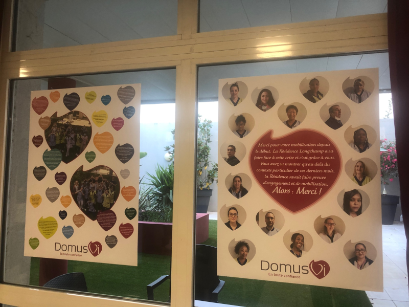 Cette semaine, les salariés ont eu la surprise de découvrir des affiches avec l'ensemble des mots de remerciement des familles mais aussi une bâche de remerciement avec leurs prénoms sur la façade de la Résidence.