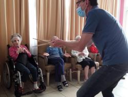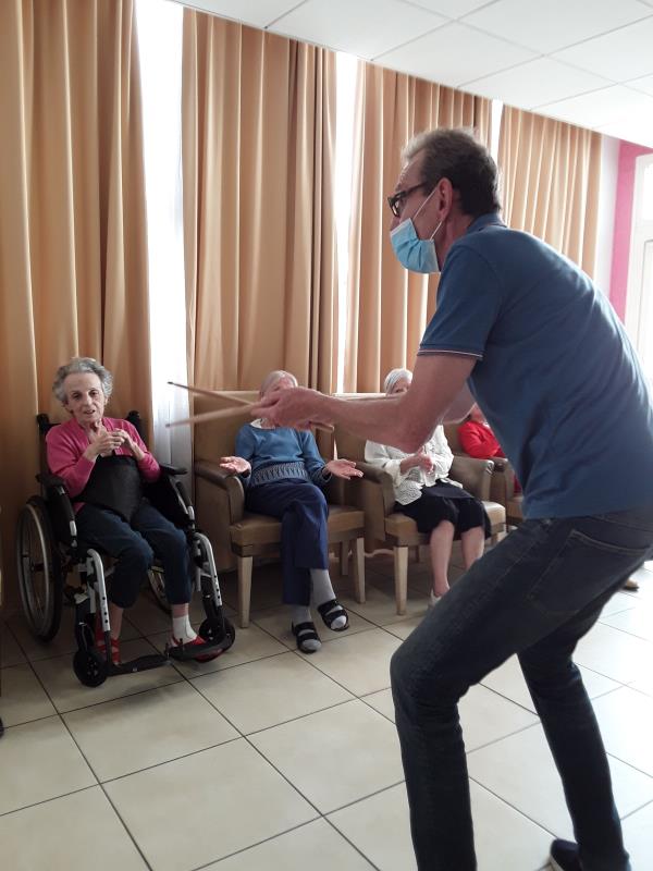 Hier après- midi, les murs de l'unité protégée ont vibré aux sons des percussions. Les résidents ont suivi le rythme avec des maracas, crécelles et autres instruments. Guides par Nicolas, ces derniers se sont laissés emportés par des airs entraînants.