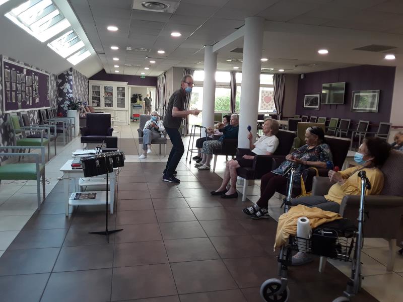 Mercredi repos musculaire mais stimulation musicale avec un atelier percussion en compagnie de Nicolas , maracas et crécelles.
