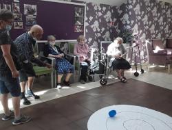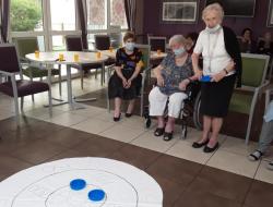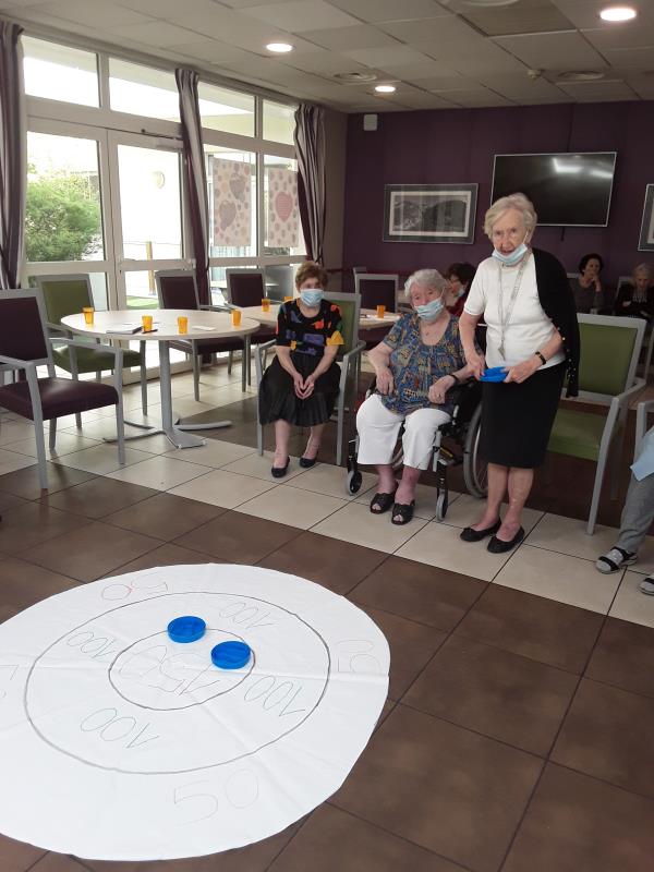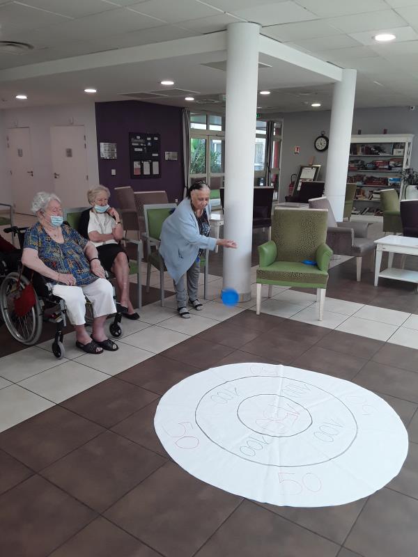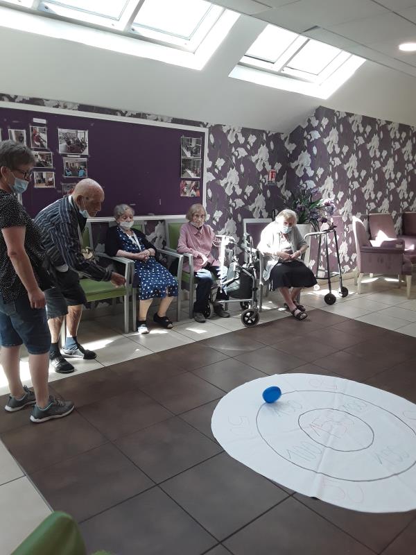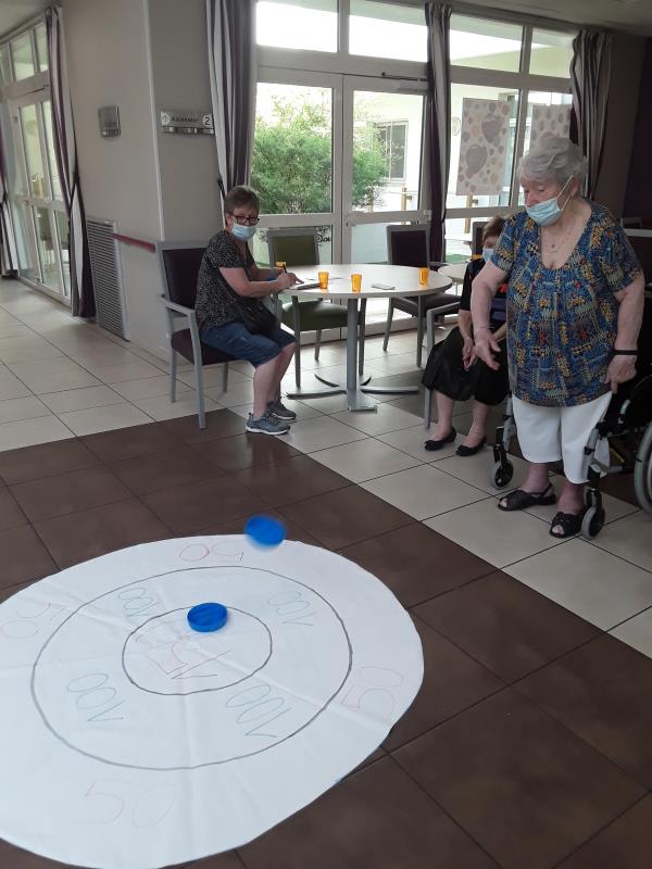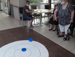 En ce mercredi 5 Août, nos résidents ont inauguré un nouveau jeu créé par Agnès et Sandrine, les jeux des palets. Les résidents ont apprécié l'activité et y rejoueront avec plaisir. Ce jeu permet de favoriser la motricité fine, la dextérité et de travailler l'équilibre des résidents. Concentrés sur le jeu les résidents libèrent leurs gestes et font des mouvements amples sans y penser !