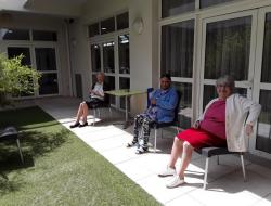 Cette après-midi, profitant d'un temps clément et ensoleillé, quelques résidents ont profité des rayons du soleil pour faire le plein de vitamines et commencer le bronzage estival. Accompagnés de l'animatrice, ces derniers ont pu respirer le bon air tout en faisant des jeux. Moment agréable et bienfaiteur!